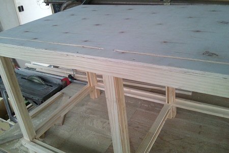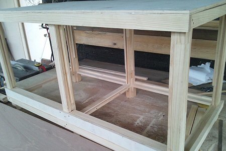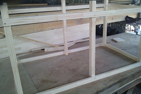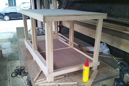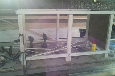 右写真から二日目。天井板(1820×910)と、底ベニヤ板(1820×910)と、前面のアクリル板(600×450)を購入。