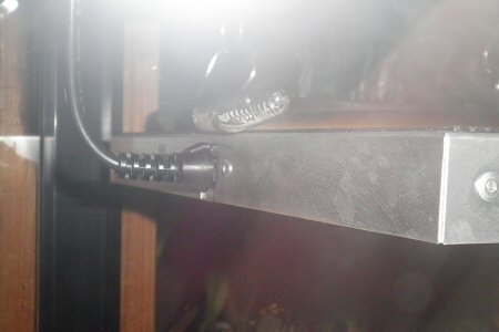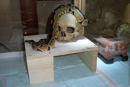 ケージ内の天井に付けた百均のLEDライトが骸骨を照らす