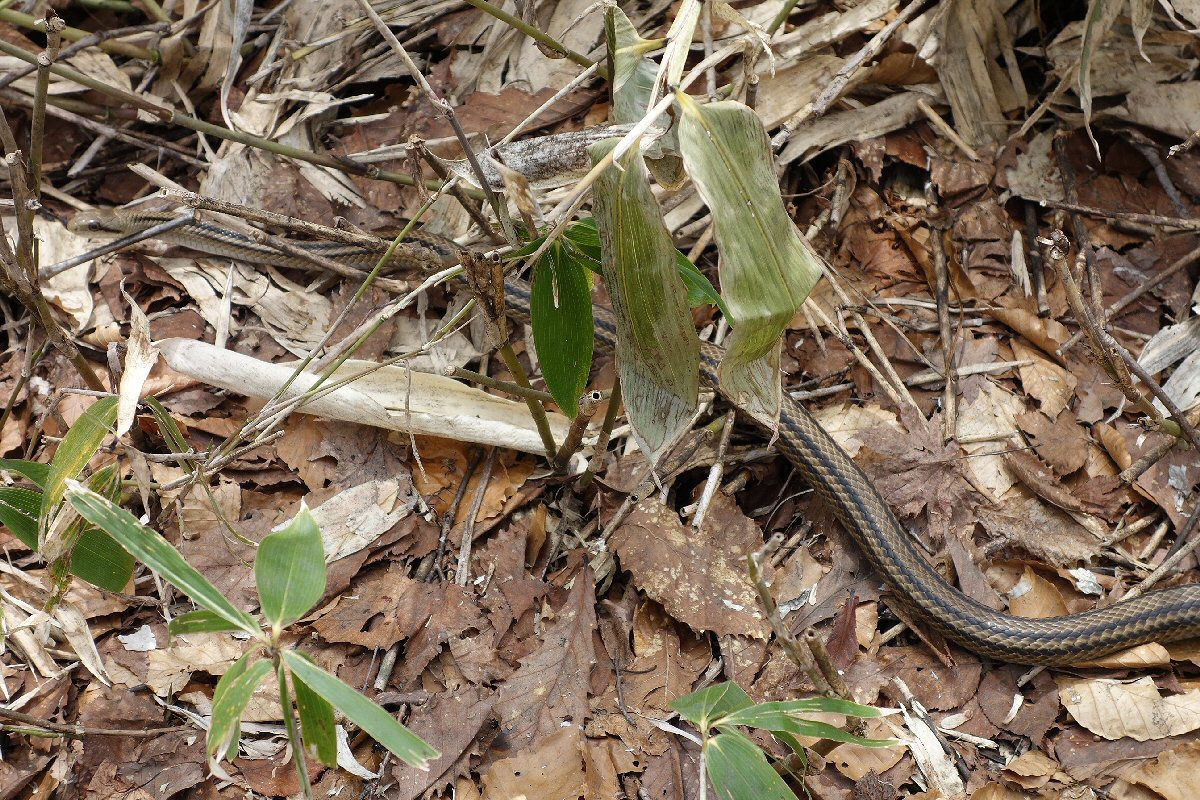 真昼間に、山道の直ぐ脇をシマヘビが居たので記念写真。